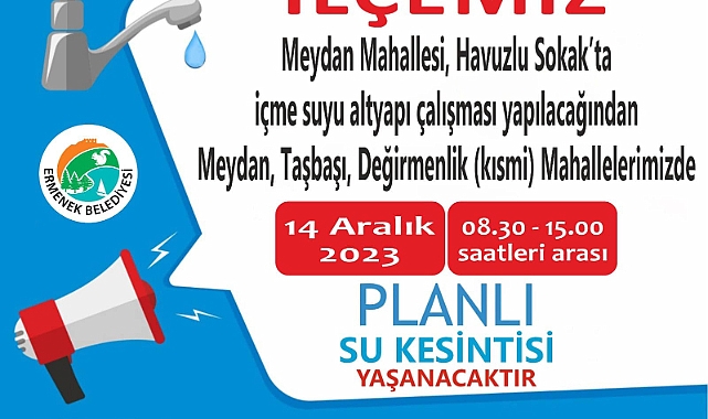 Meydan mahallesi Havuzlu sokakta içme suyu altyapı çalışması yapılacağından Meydan, Taşbaşı,Değirmenlik mahallelerinde 14 Aralık Perşembe günü 08:30 ile 15:00 arası kısmi su kesintisi yaşanabilir.