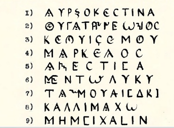 Taş üzerindeki karakterlerin standart Grek alfabesine aktarılmış hali: